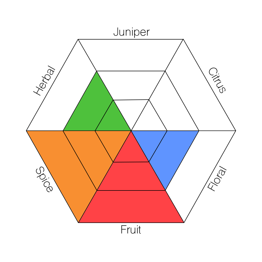 The main taste profiles in gin are: Juniper, Citrus, Floral, Fruit, Spice, and Herbal.