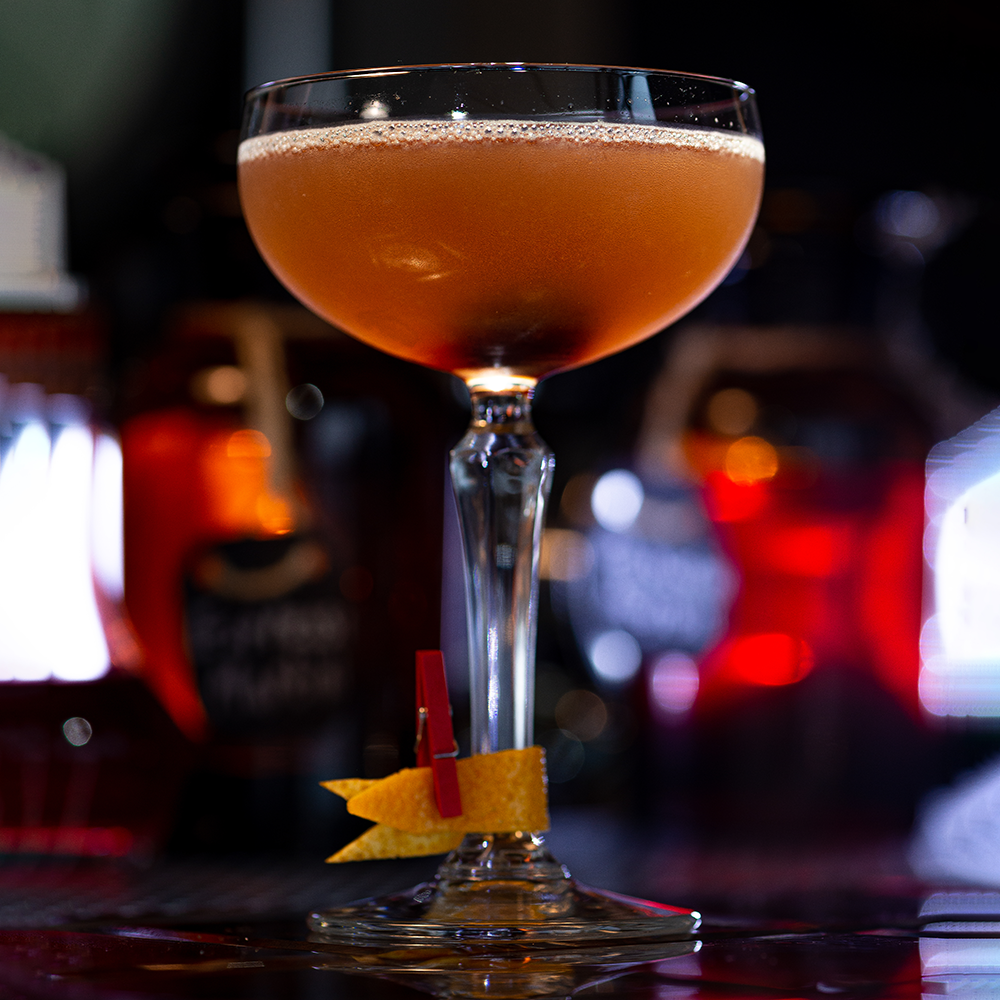- Garnish with the orange peel twist