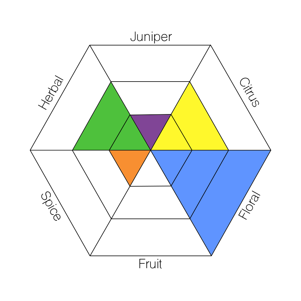 The main taste profiles in gin are: Juniper, Citrus, Floral, Fruit, Spice, and Herbal.