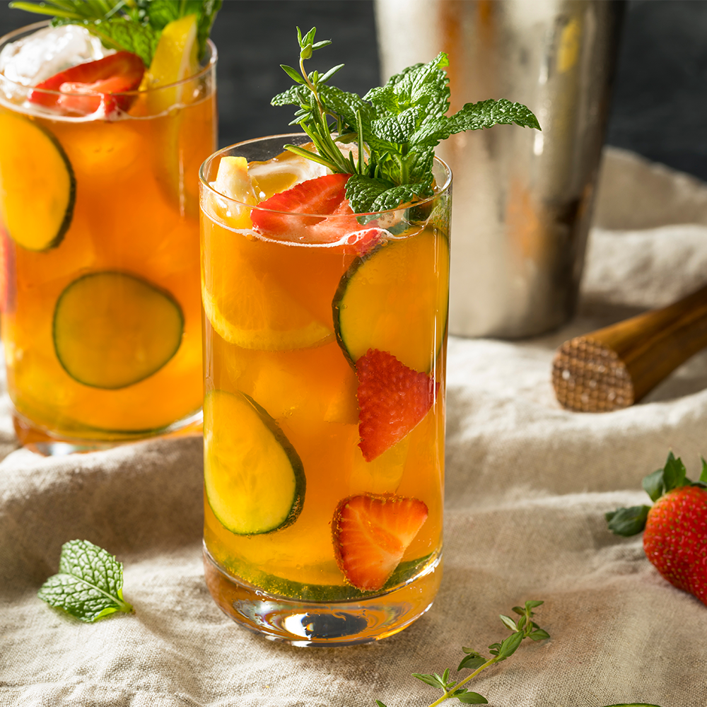 - Layer the strawberries and cucumber ribbon in a chilled highball glass with ice