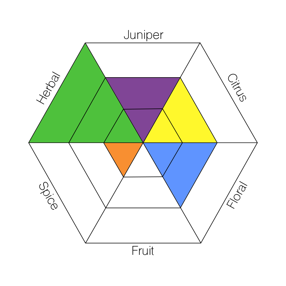 The main taste profiles in gin are: Juniper, Citrus, Floral, Fruit, Spice, and Herbal.