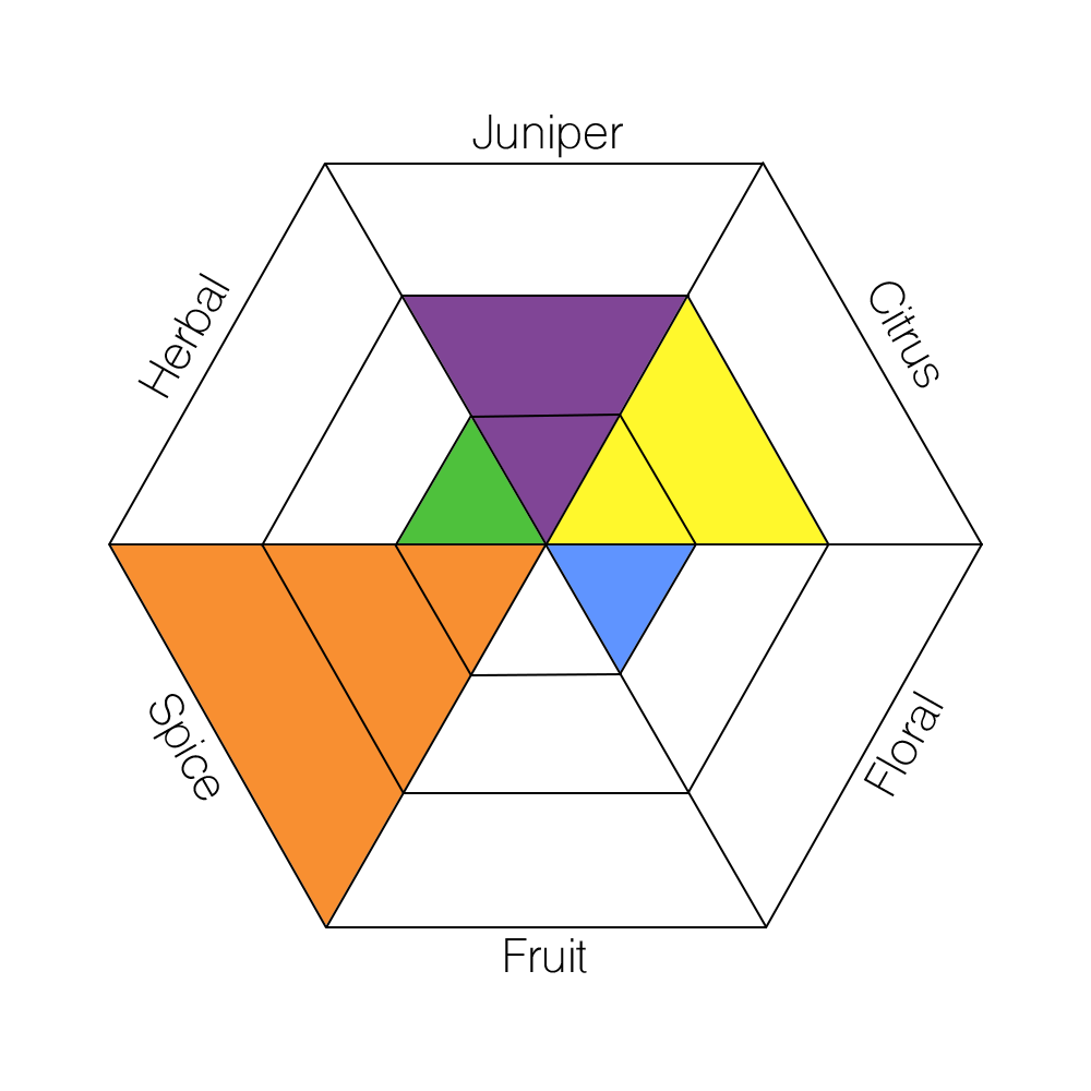 The main taste profiles in gin are: Juniper, Citrus, Floral, Fruit, Spice, and Herbal.