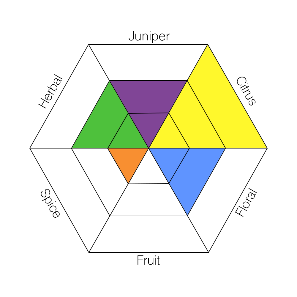 The main taste profiles in gin are: Juniper, Citrus, Floral, Fruit, Spice, and Herbal.