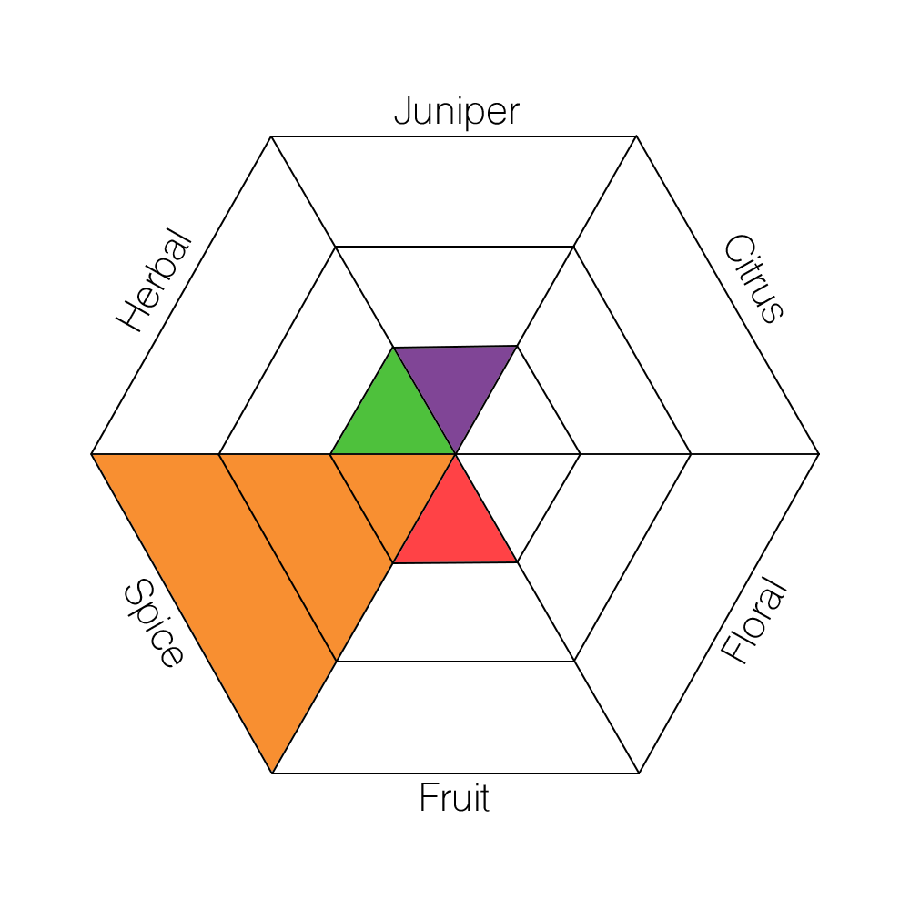 The main taste profiles in gin are: Juniper, Citrus, Floral, Fruit, Spice, and Herbal.