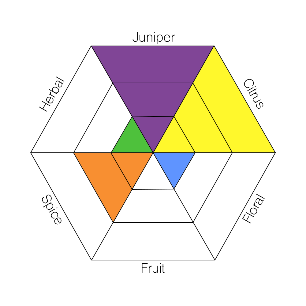 The main taste profiles in gin are: Juniper, Citrus, Floral, Fruit, Spice, and Herbal.