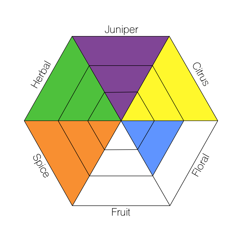 The main taste profiles in gin are: Juniper, Citrus, Floral, Fruit, Spice, and Herbal.