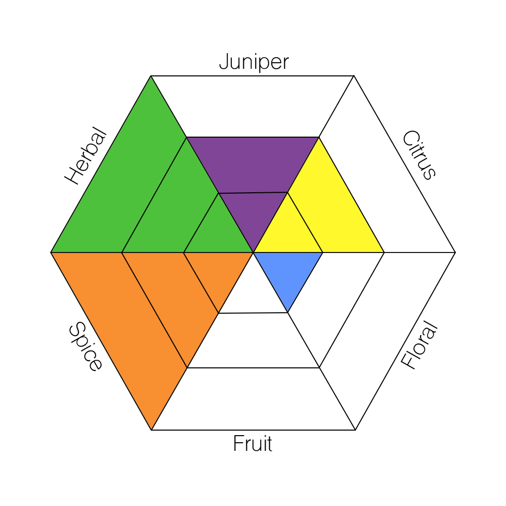 The main taste profiles in gin are: Juniper, Citrus, Floral, Fruit, Spice, and Herbal.