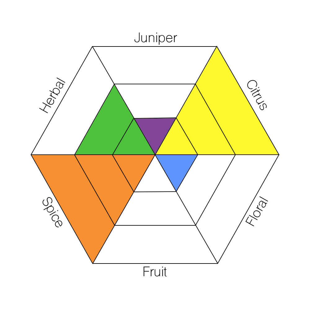 The main taste profiles in gin are: Juniper, Citrus, Floral, Fruit, Spice, and Herbal.