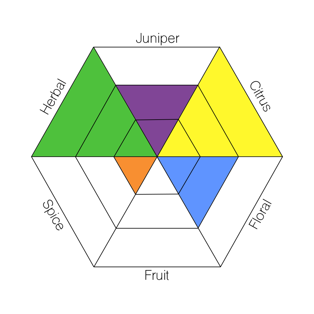 The main taste profiles in gin are: Juniper, Citrus, Floral, Fruit, Spice, and Herbal.