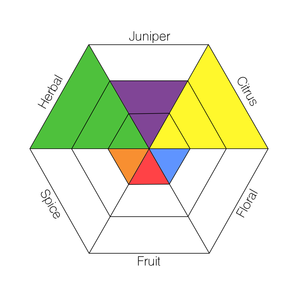 The main taste profiles in gin are: Juniper, Citrus, Floral, Fruit, Spice, and Herbal.