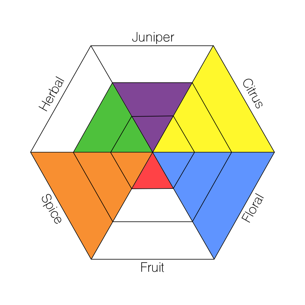 The main taste profiles in gin are: Juniper, Citrus, Floral, Fruit, Spice, and Herbal.