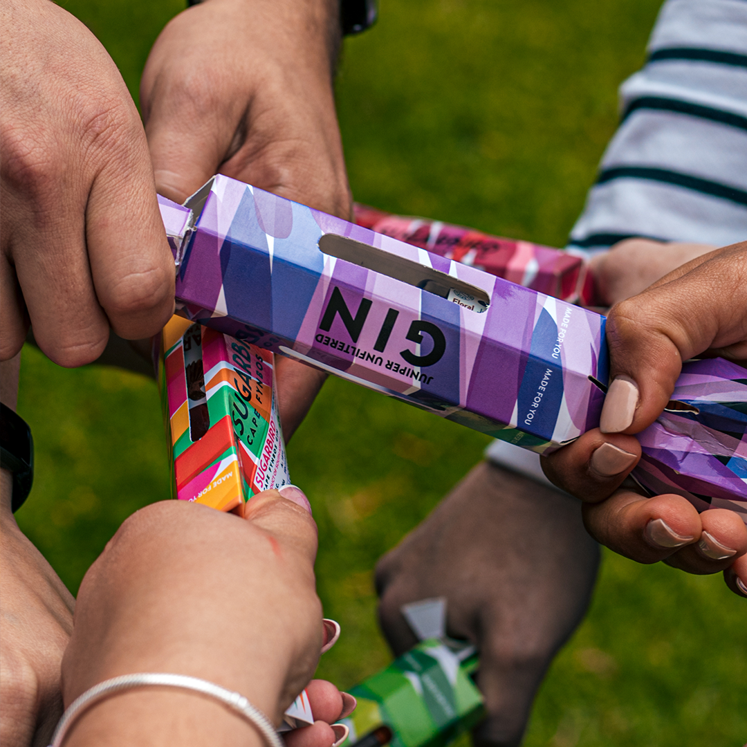 Each cracker contains a 37.0% ABV 40ml bottle of one of six different Sugarbird gins.