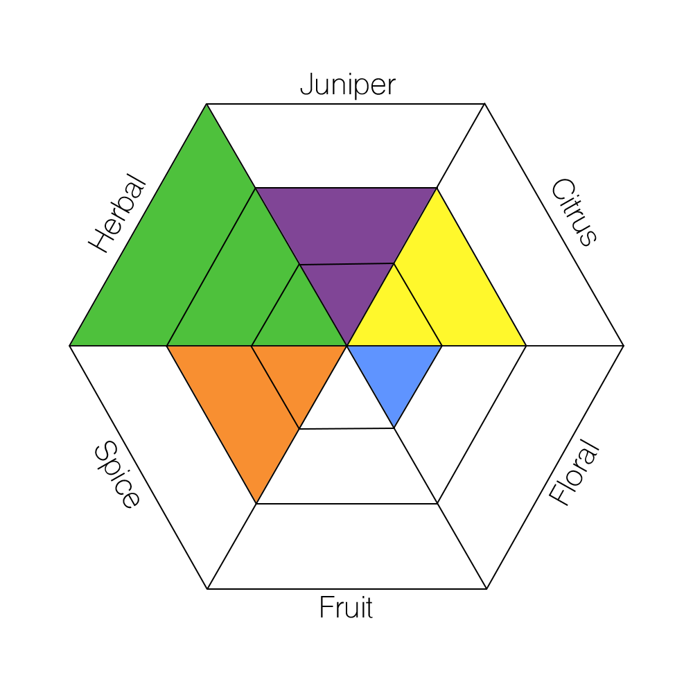 The main taste profiles in gin are: Juniper, Citrus, Floral, Fruit, Spice, and Herbal.